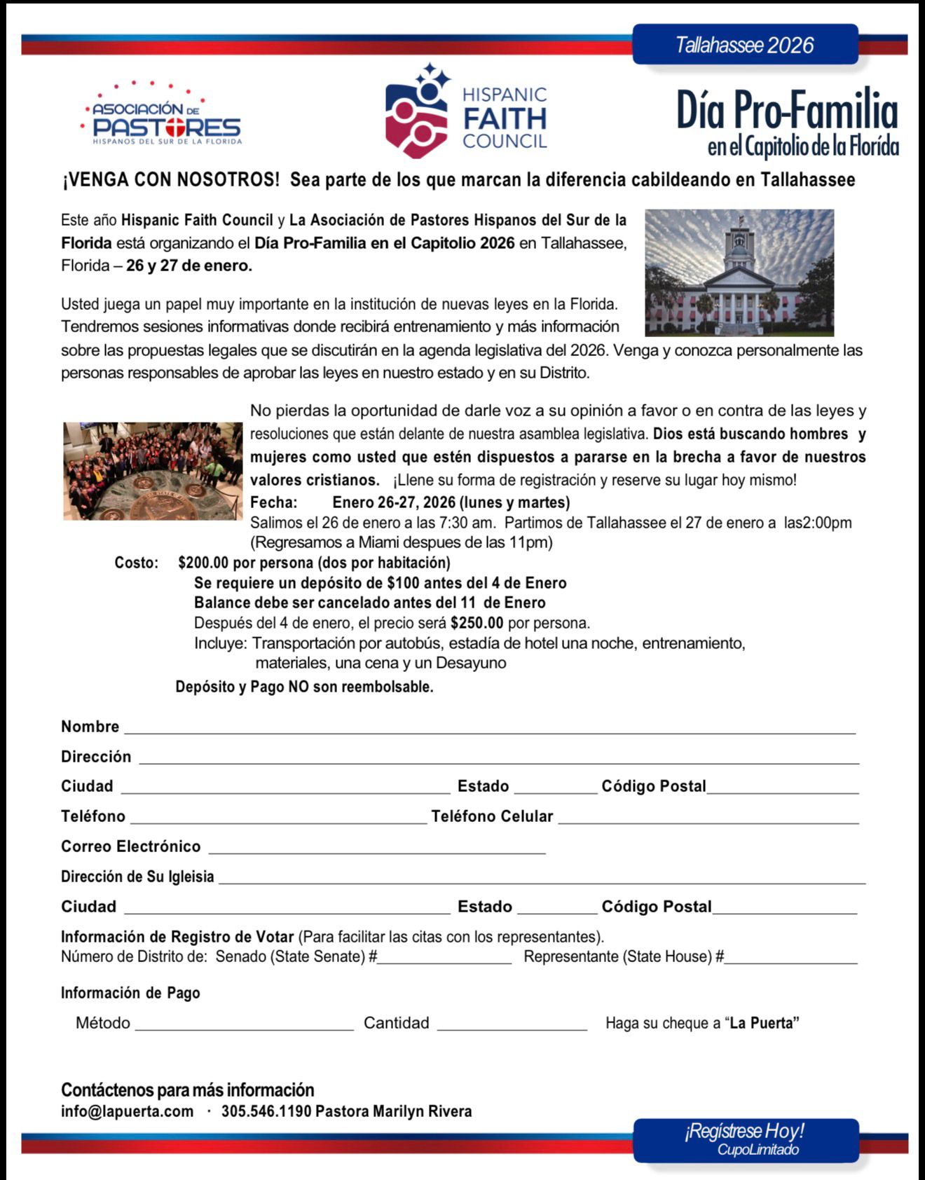 Para mayor información, contacta a Pra. Marilyn Rivera al (305) 546-1190.